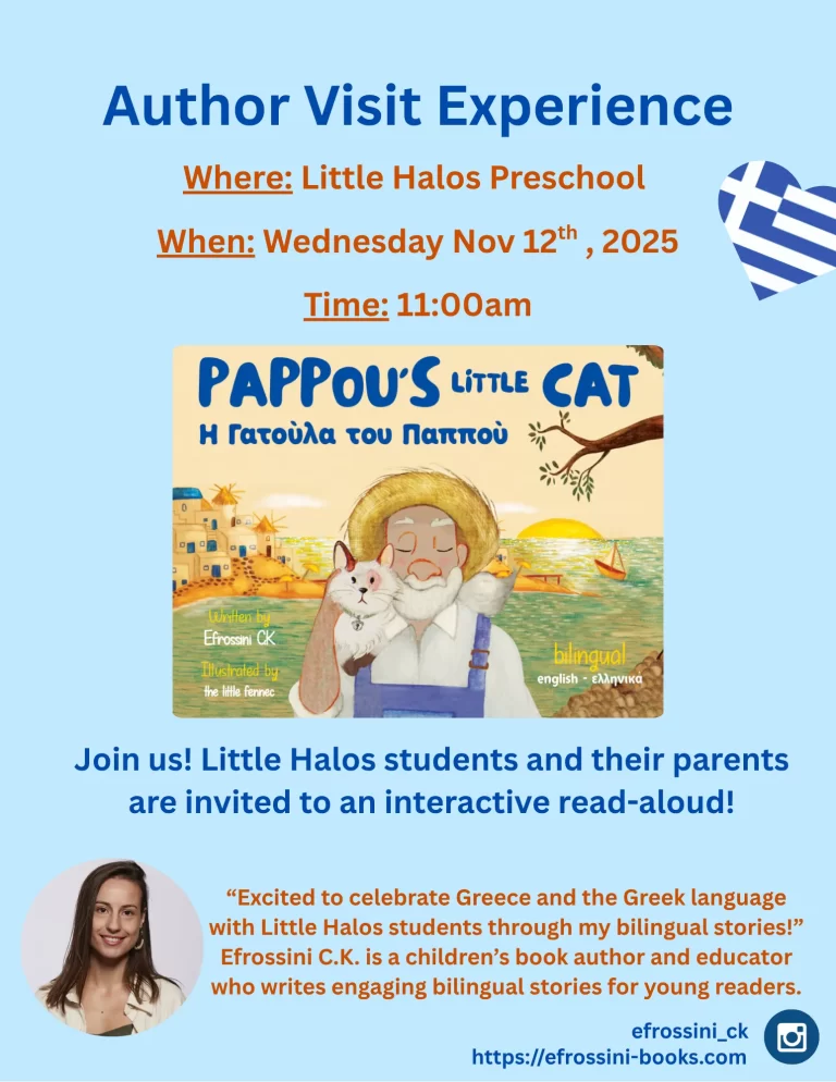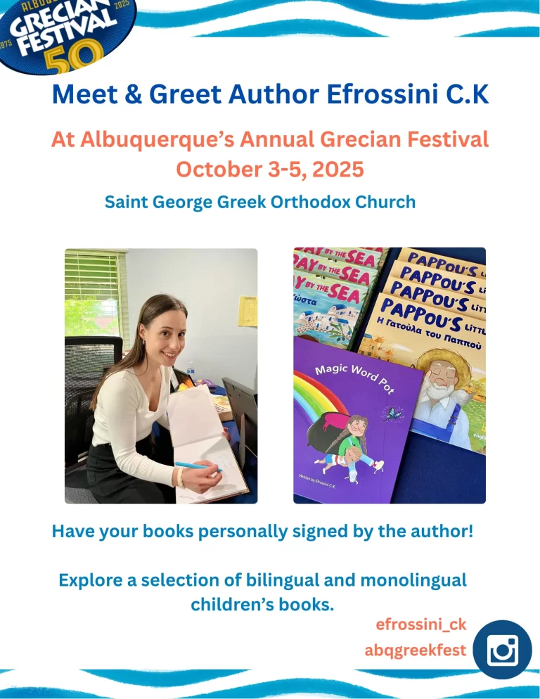 Emerging greek author Efrossini C.K. will visit Dormition church greek school to read her bilingual children's book.